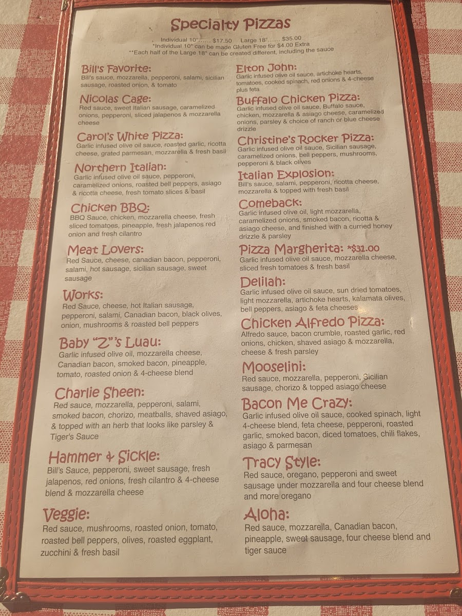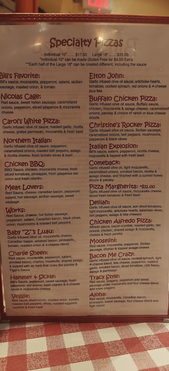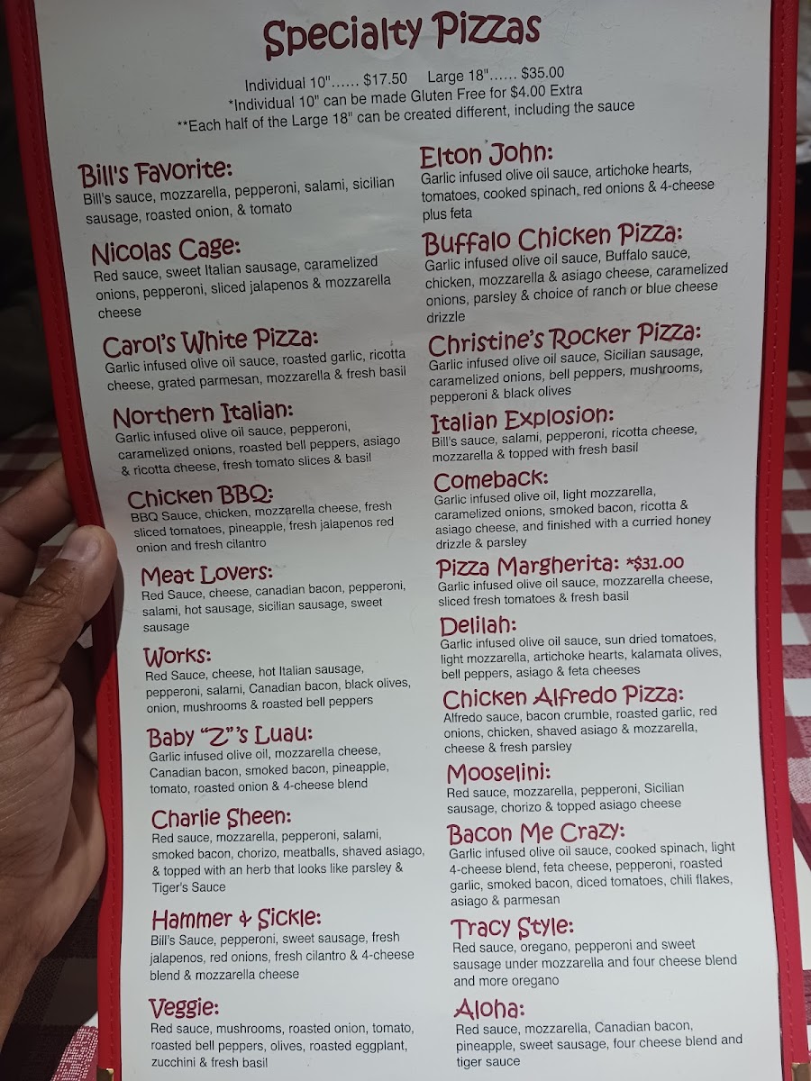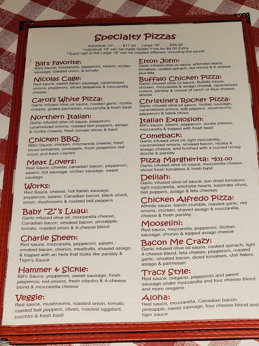 At Bill's, you'll find a refreshing approach to pizza with the option to build your own masterpiece. Choose from a plethora of delicious toppings, including anchovies, artichoke hearts, housemade meatballs, and sweet Italian sausage. For those who prefer a more guided experience, try their specialty pizzas such as 'Bill's Favorite,' which features a unique blend of pesto and red sauce, salami, and roasted onions, or the bold and flavor-packed 'Buffalo Chicken Pizza' drizzled with spicy buffalo sauce and topped with mozzarella and asiago cheeses.