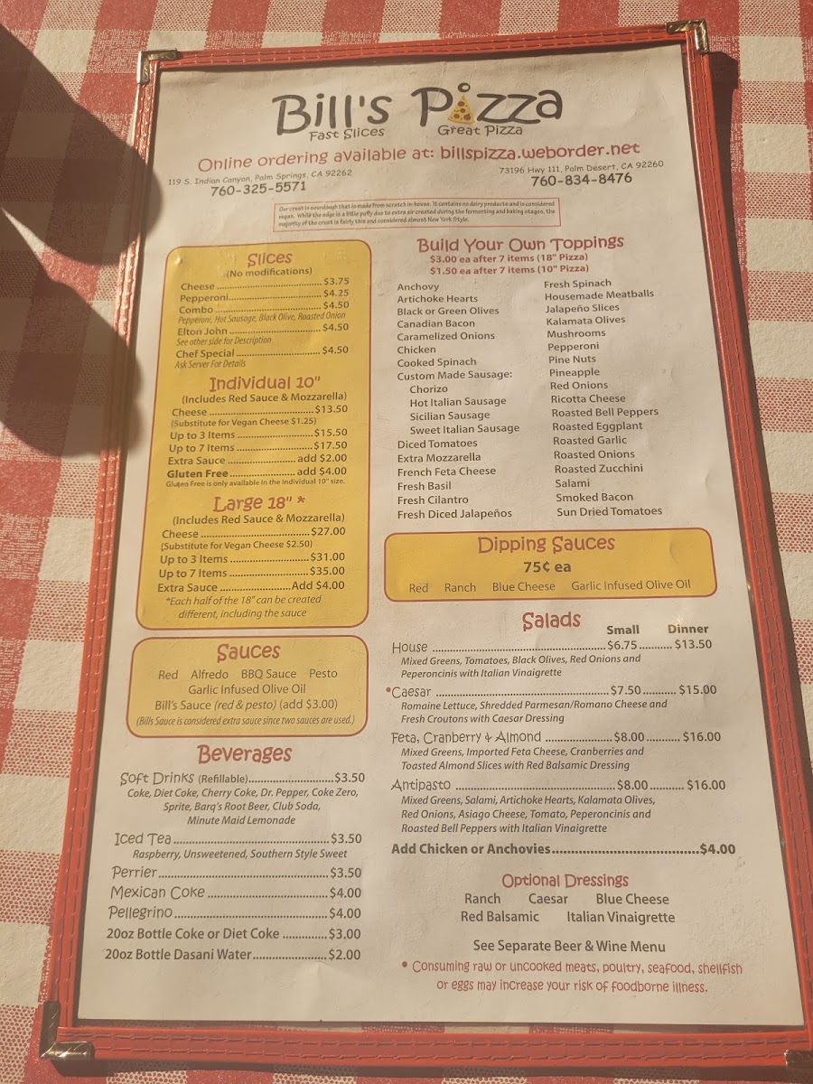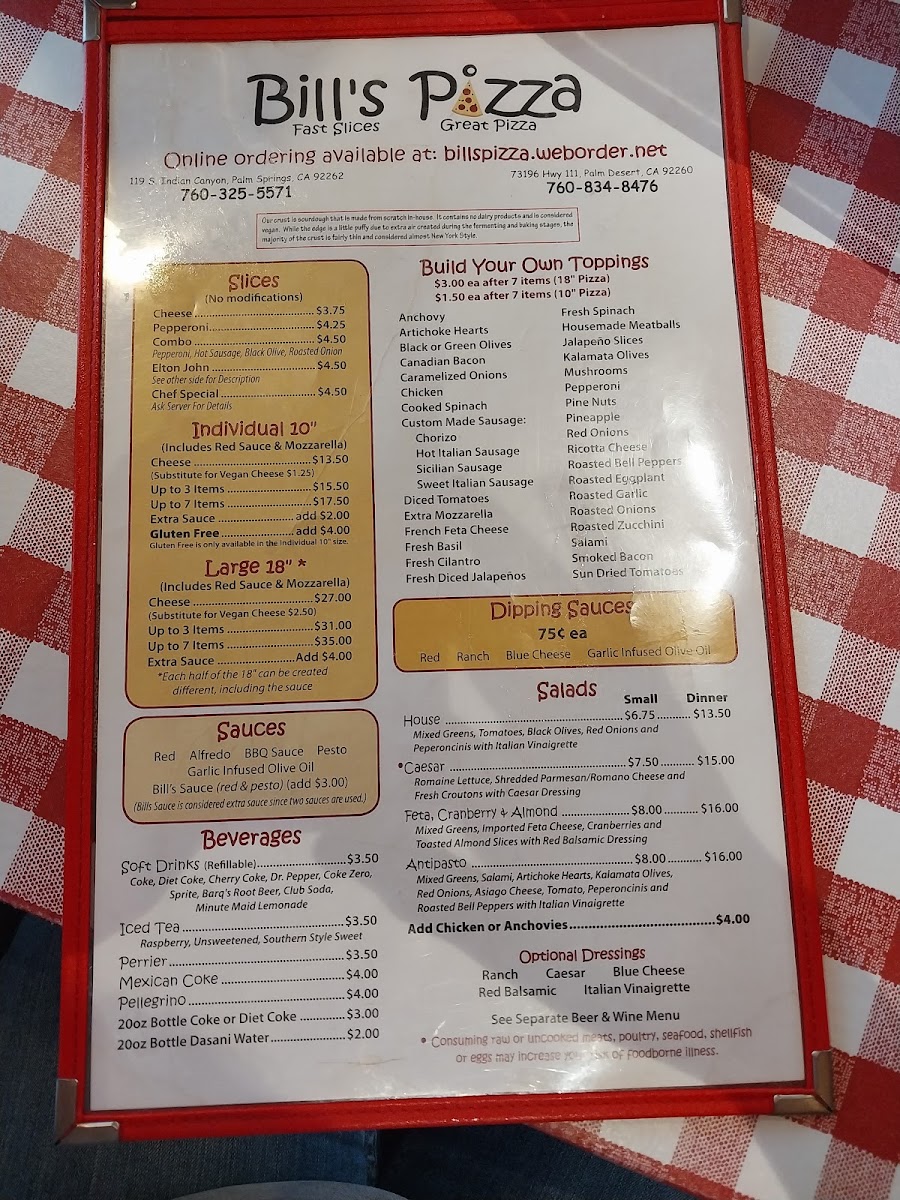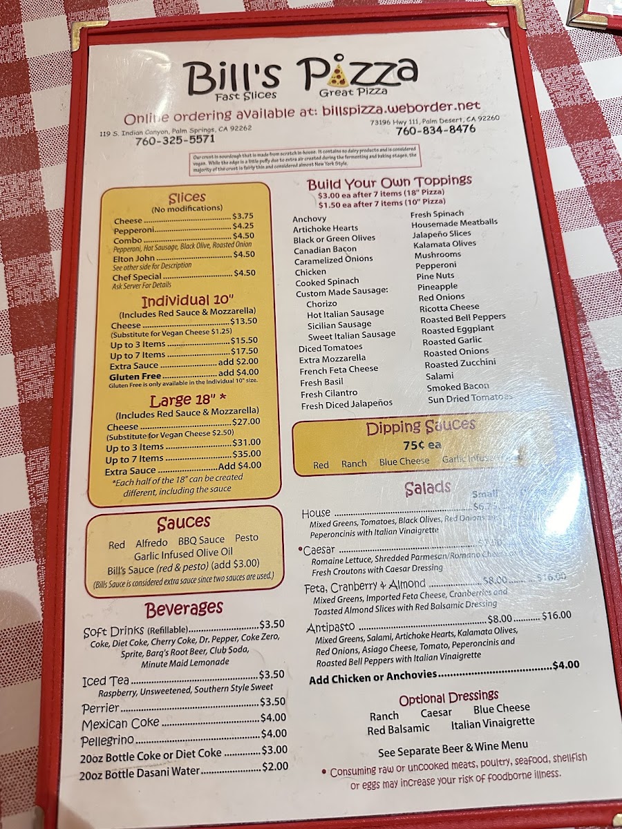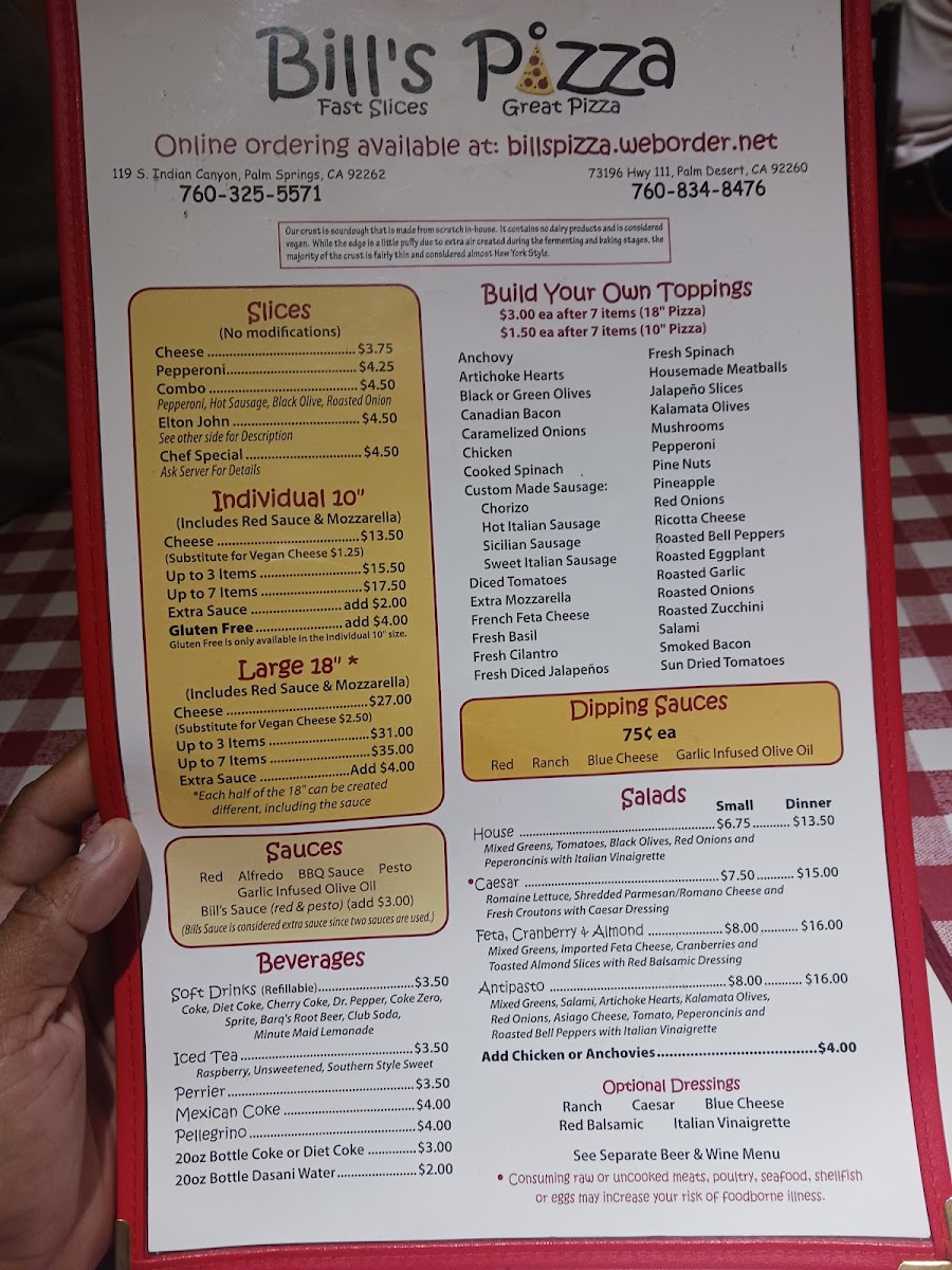 Welcome to Bill's Pizza, a hidden gem nestled in the heart of Palm Springs, California! Located at 119 S Indian Canyon Dr, this delightful eatery is a must-visit for pizza lovers seeking a satisfying and memorable dining experience. With a cozy ambiance and a menu that celebrates the classic artistry of pizza making, Bill's Pizza is where tradition meets modern flavors.